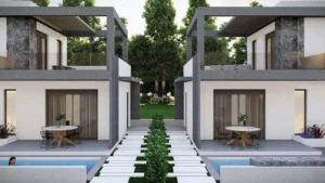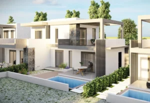 Typical product: two‑level maisonette / villa with loft (ground + loft), private patio / pool in some units.